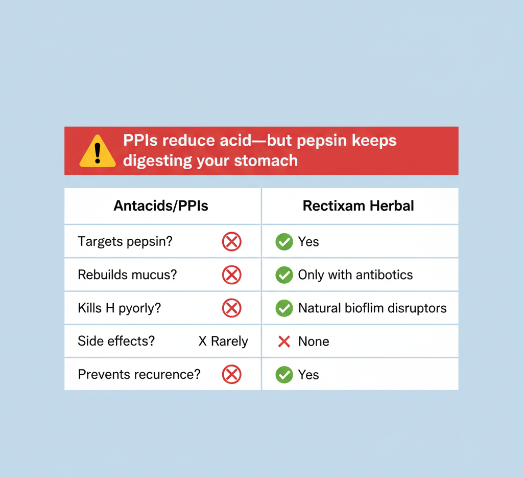 - No Withdrawal Fear: Unlike PPIs (which cause rebound acid when stopped), Rectixam strengthens your stomach—so you can taper off with confidence.